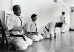 «Одно и тоже упражнение нужно повторять по сто, по тысячу раз в день. Отжимание на руках — 1000 раз; ката — „омотэ“ (открытая форма) и „ура“ (с вращением) по 100 раз каждое; кумитэ — 100 раз; удары руками и ногами в воздух — по 100 раз каждый удар. Это нужно делать каждый день.» Ояма Масутацу |