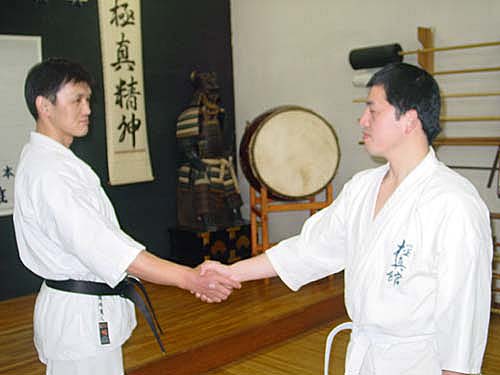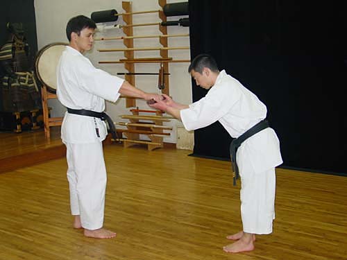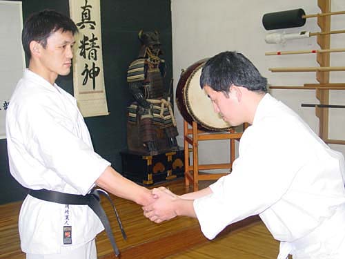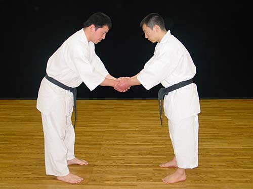Рукопожатие имеет значение «благодарности» и «уважения». В Будо, обмениваясь рукопожатием с человеком выше Вас по званию, обязательно следует пожимать двумя руками (Фото